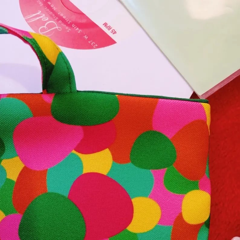 Polyester fabric bag with a green, pink, yellow, and orange print. Two handles for carrying by hand or on the shoulder. Green canvas interior and snap closure. Completely handmade by me with materials made in Europe.