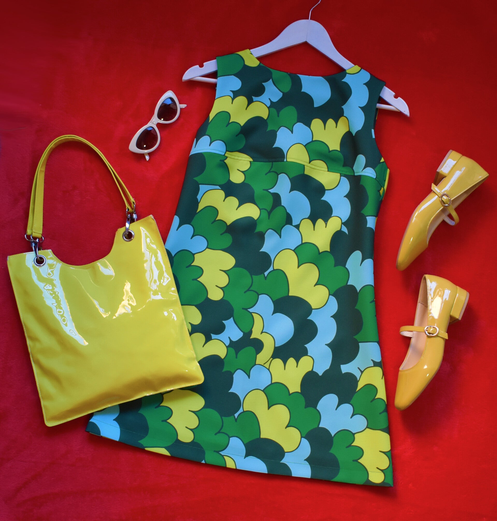 Handmade in non-stretch polyester in shades of green, yellow, and light blue.