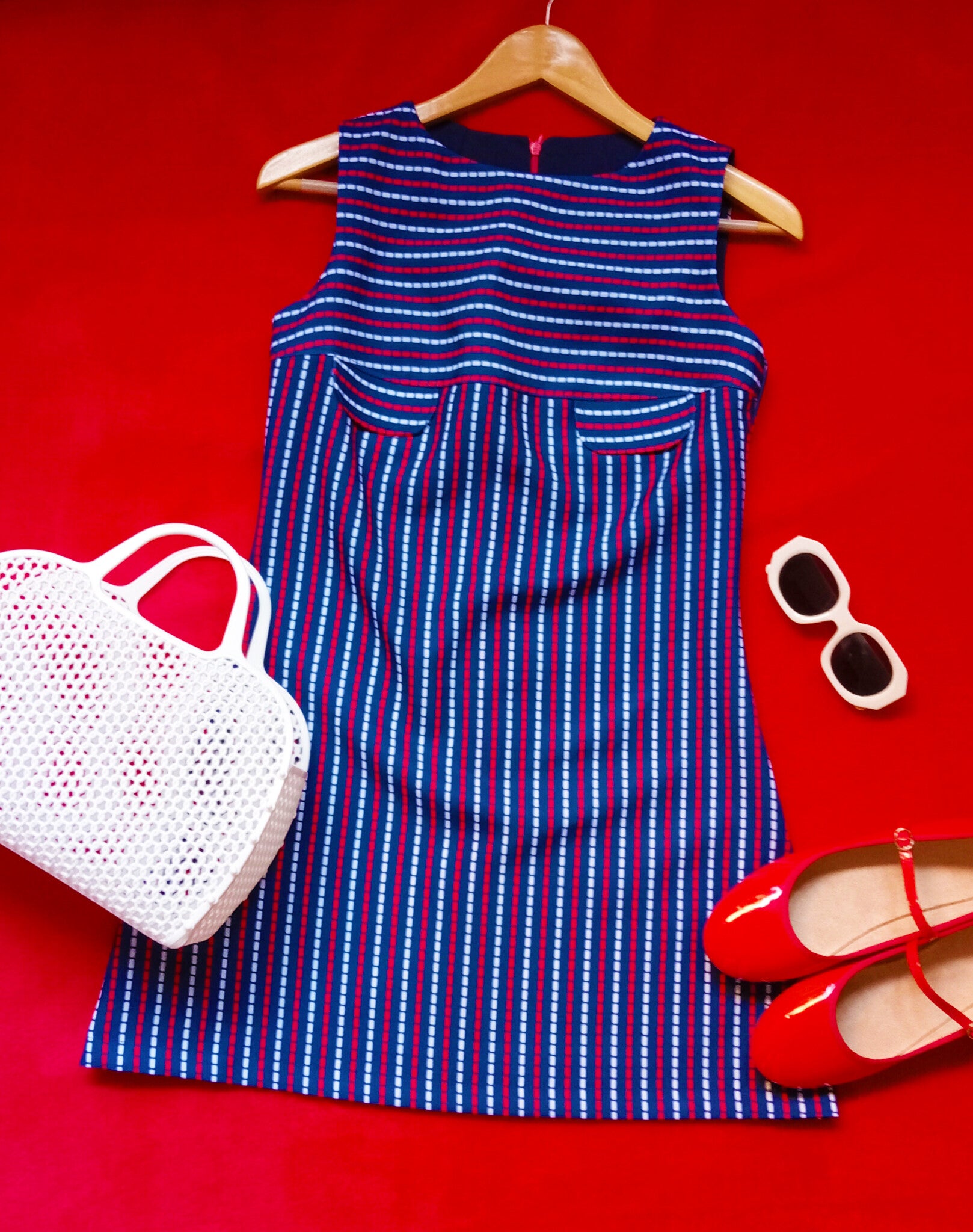 Handmade in non-stretch polyester in navy blue with white and red stripes.