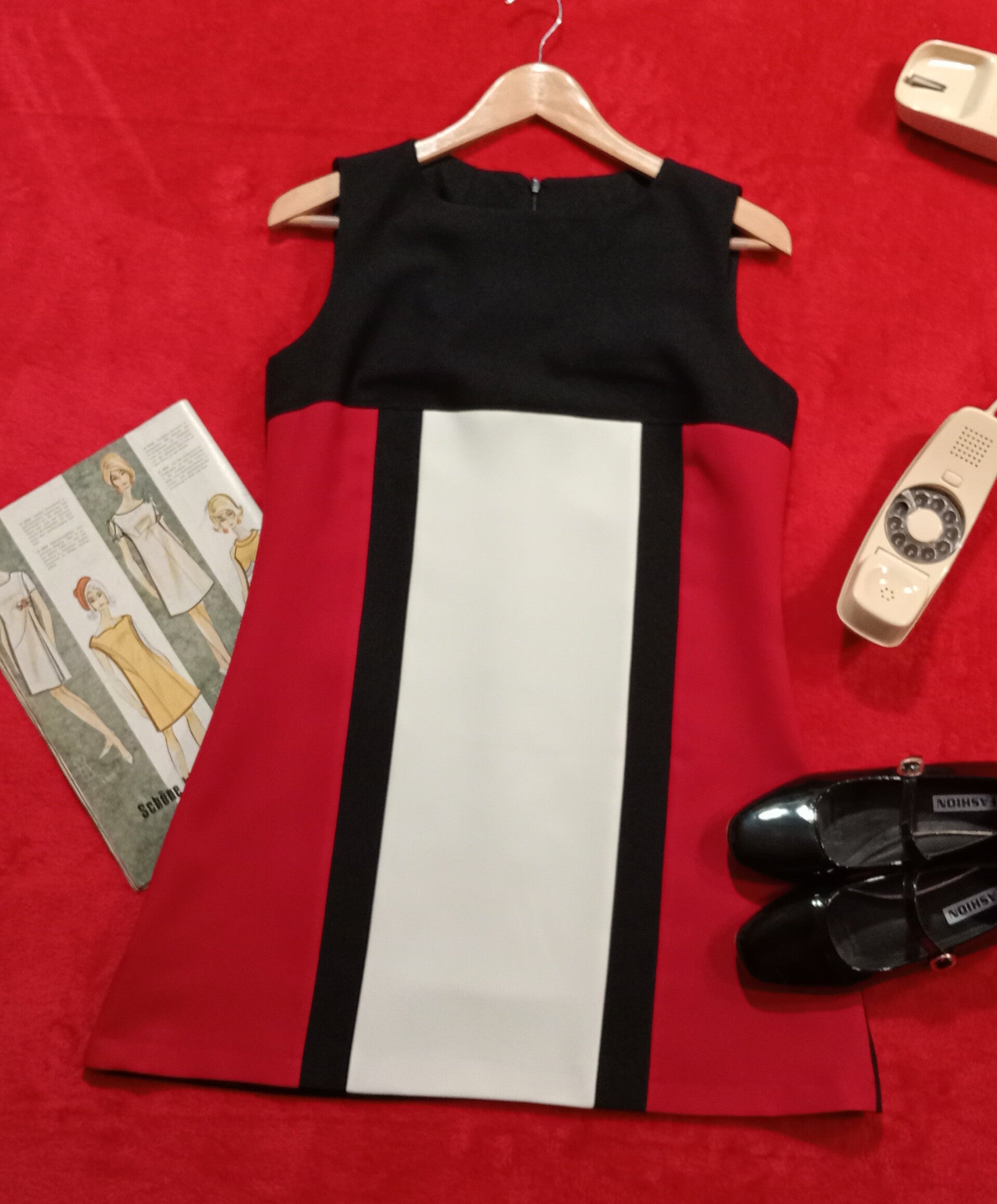 60s-style dress. A-line / trapeze cut, NOT fitted. Handmade in non-stretch polyester in 2 or 3 colors. Zippered back. Can be made in any size you need. NOT CUSTOM MADE, but I will use your body measurements to determine your size and adjust the pattern slightly if necessary. Remember to let me know when placing your order.
