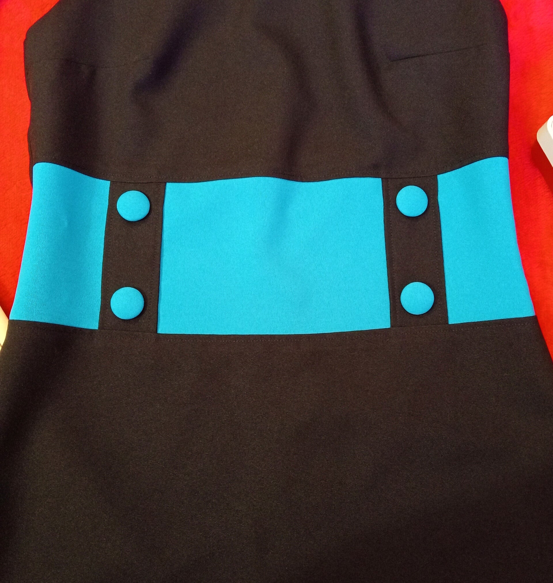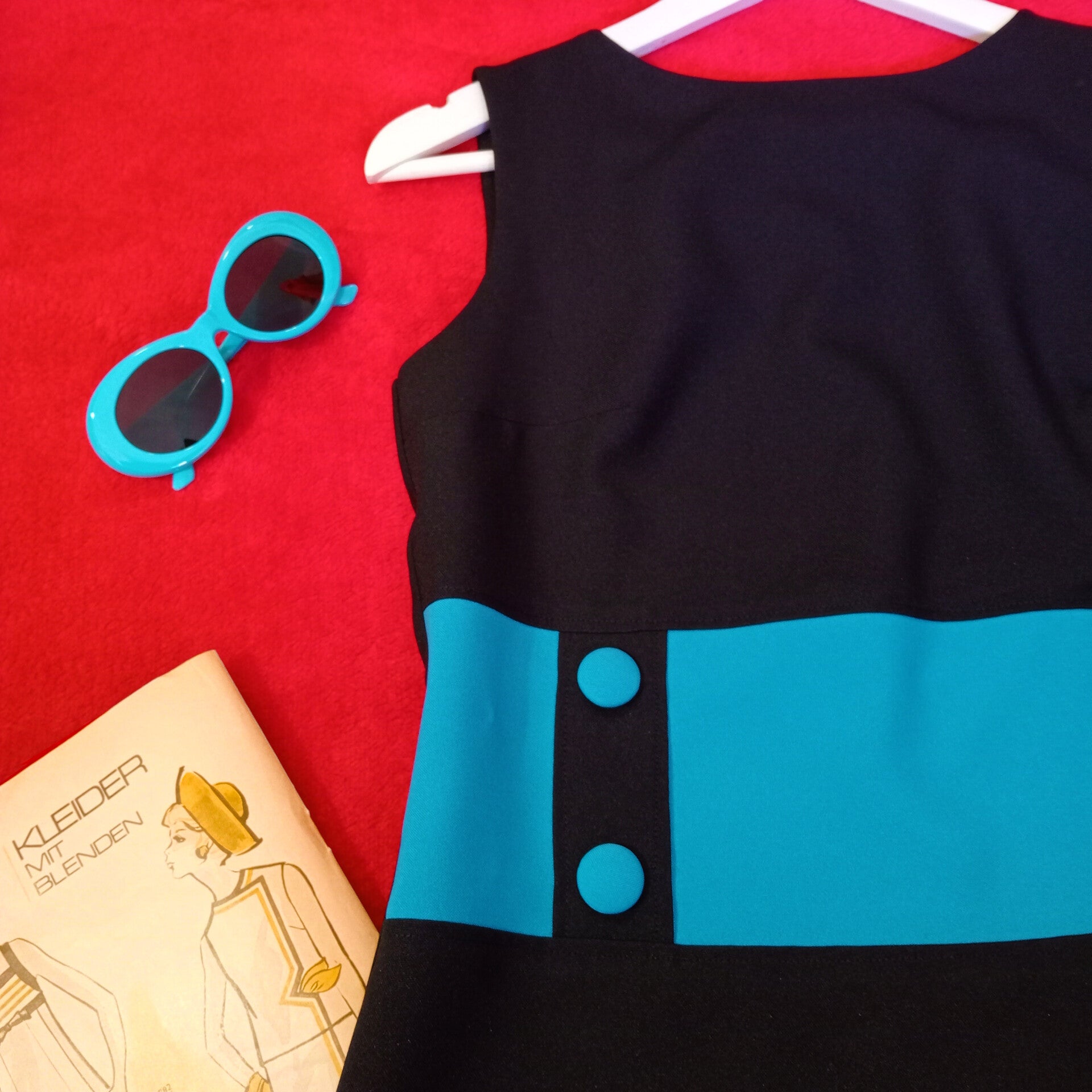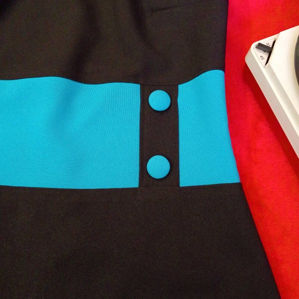 Short sixties-style dress. A-line trapeze cut, NOT fitted. Handmade in non-stretch polyester in 2 colors. Zippered back. Can be made in any size you need. NOT CUSTOM MADE, but I will use your body measurements to determine your size and adjust the pattern slightly if necessary. Remember to let me know when placing your order.