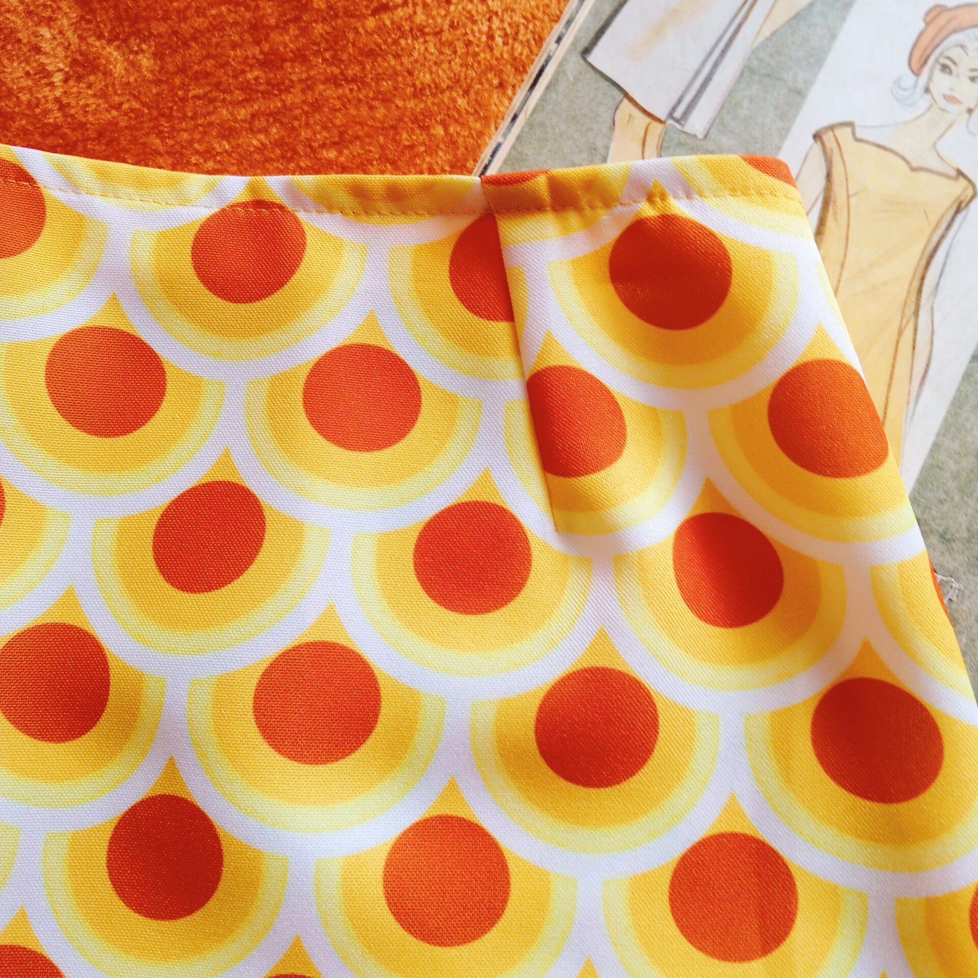 Handmade retro miniskirt in thin orange, yellow, and white polyester. Back zipper closure.