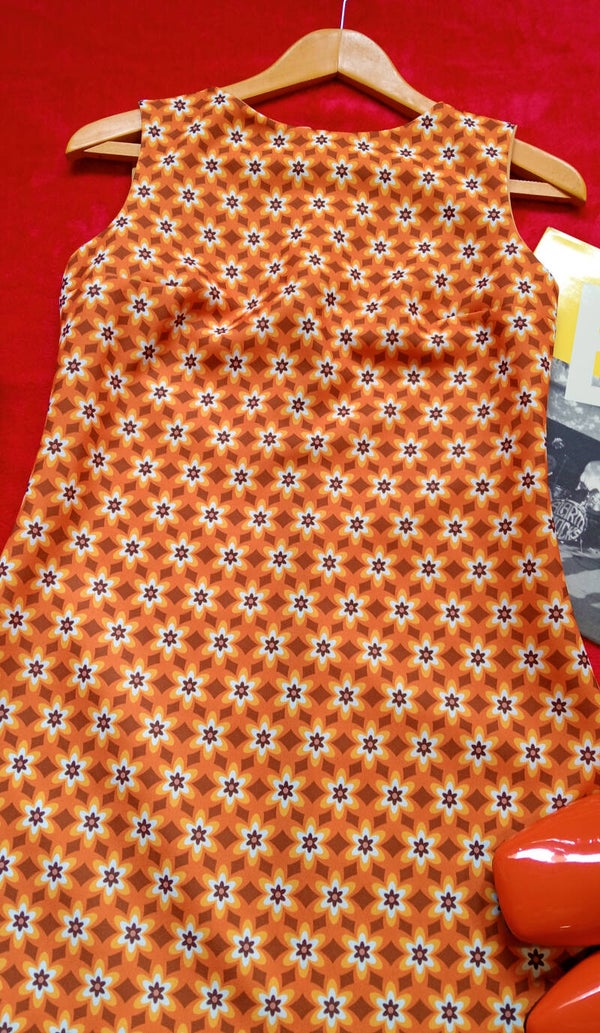 Please note that this is a trapezoid cut, NOT fitted. It should fit snugly through the bust, but full through the waist and hips to create the flared effect typical of the 1960s.
