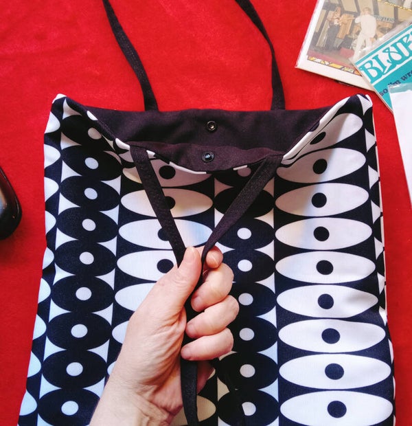 Medium size bag made of heavyweight fabric (with padded lining for extra strength) with two short handles, a solid black interior, and a snap closure.