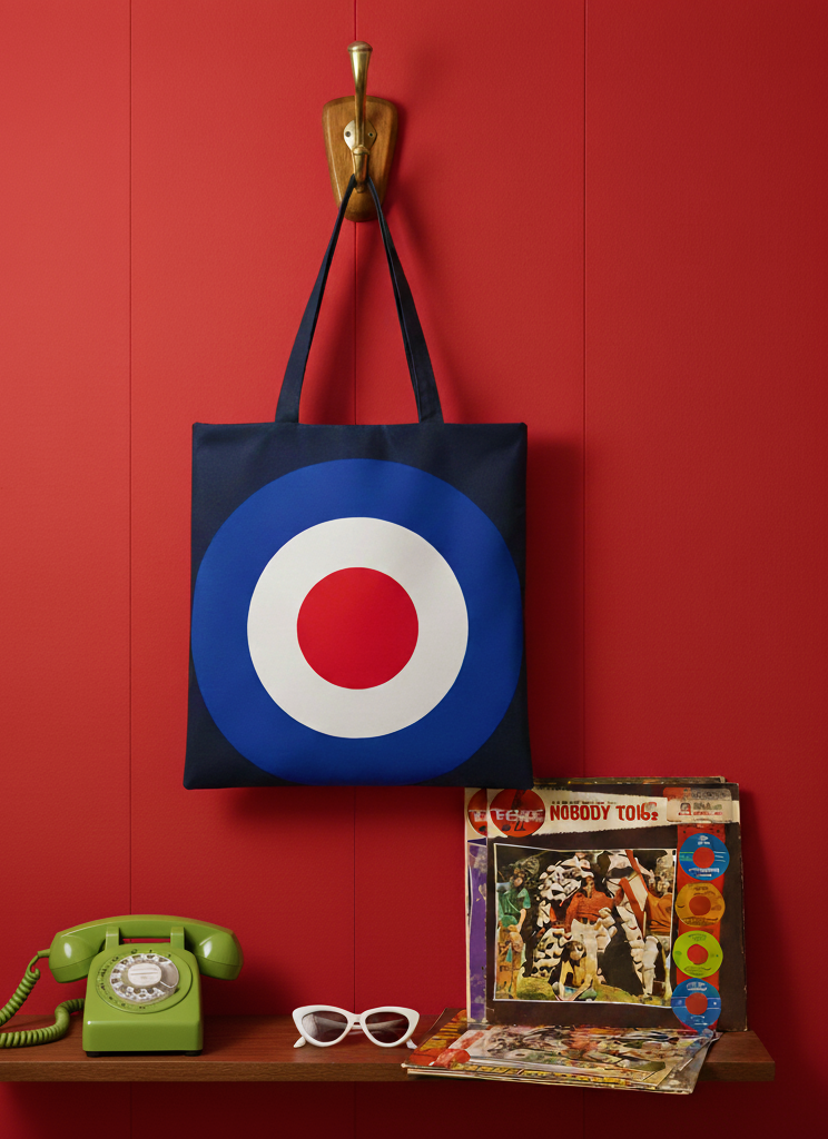 Bolso de tela grande de color negro con diana estampada en una cara. Interior forrado en negro. Medidas aprox: 42 cm x 39 cm / 16'5" x 15'3"