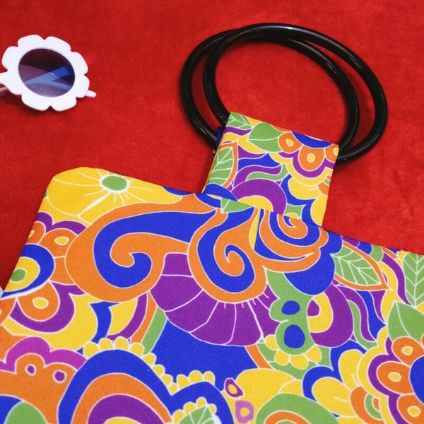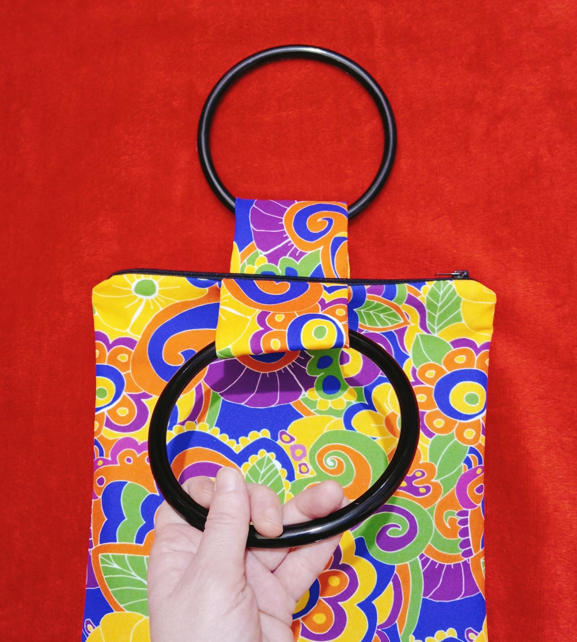 Bolso mediano de tela con forro y cremallera. Dos asas redondas de plástico negro.