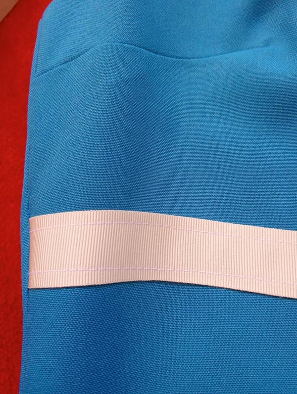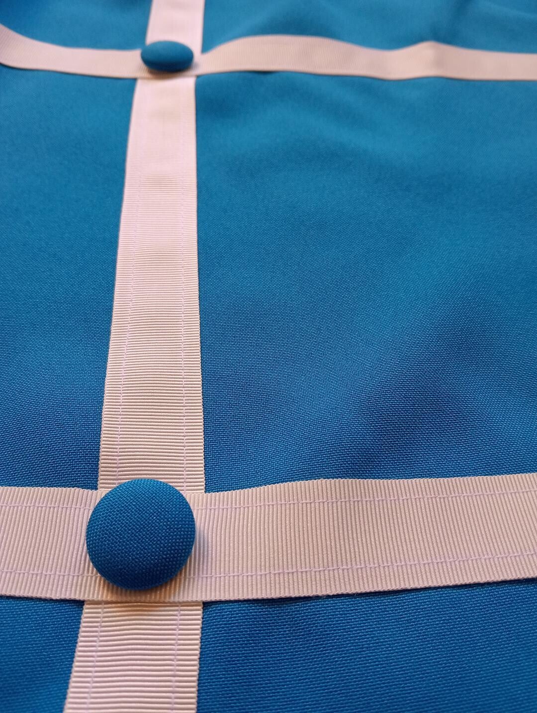 Nuevo, Hecho a mano en tela de polyester no elástico, de color azul con detalles de franjas de cinta grosgrain color blanco/marfil y botones decorativos.