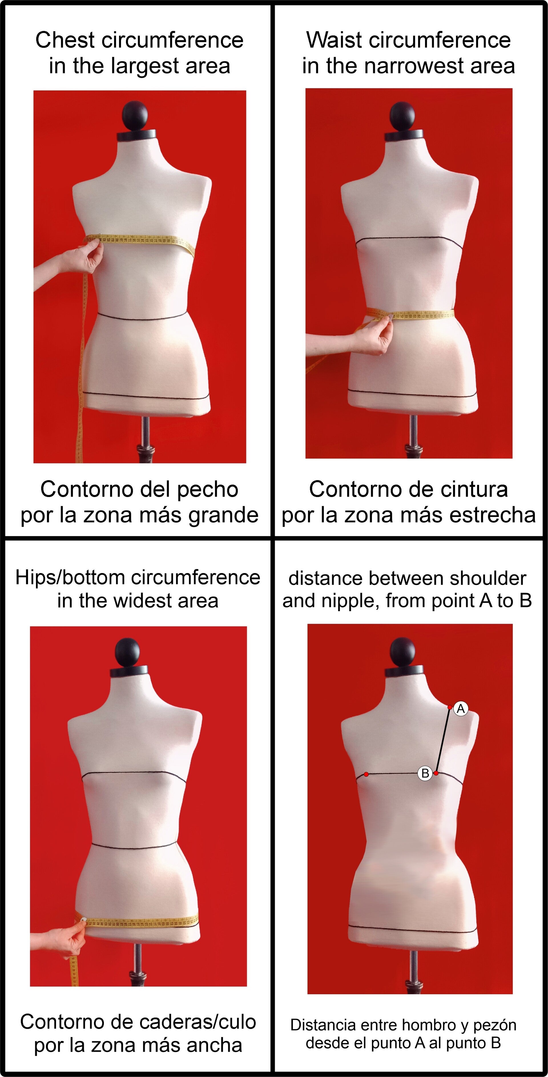 Necesito las siguientes medidas: busto, cintura, caderas y distancia de hombro a pezón (puedes verlas en las imágenes).