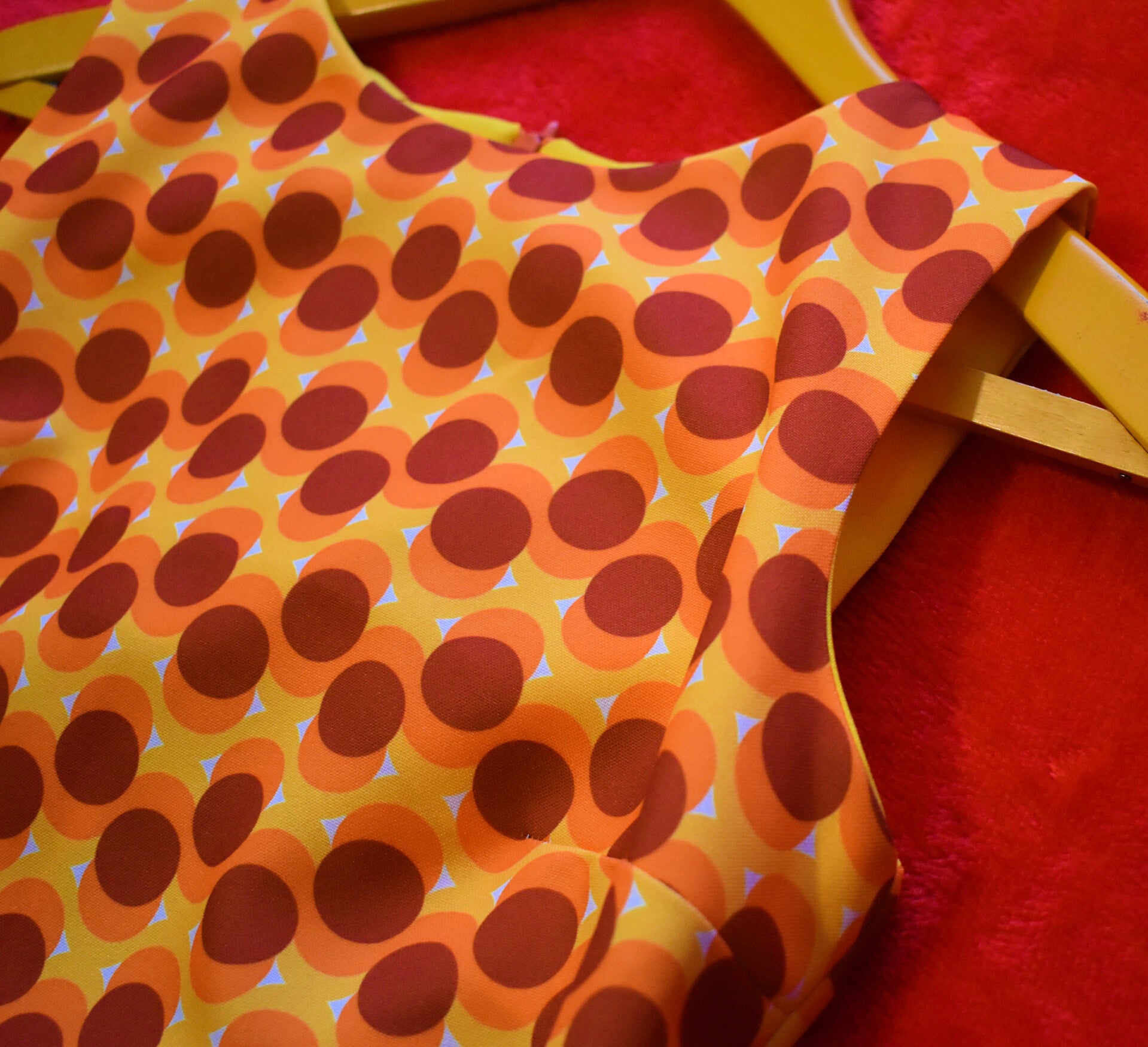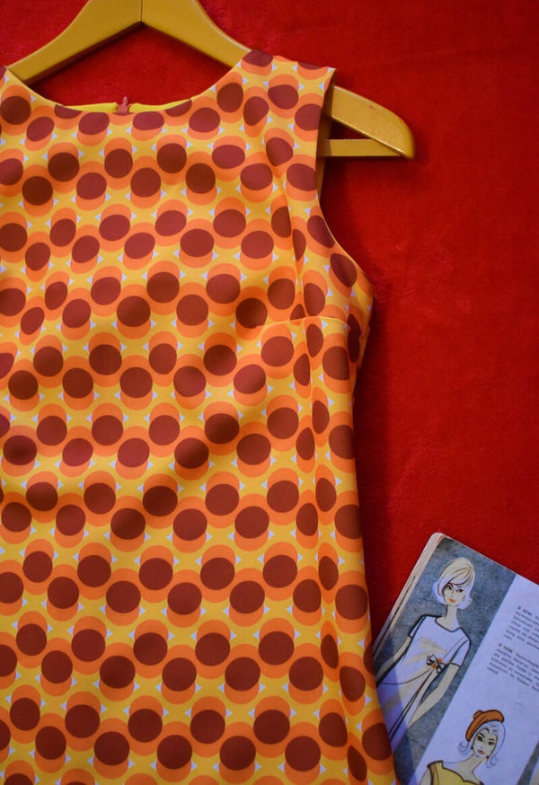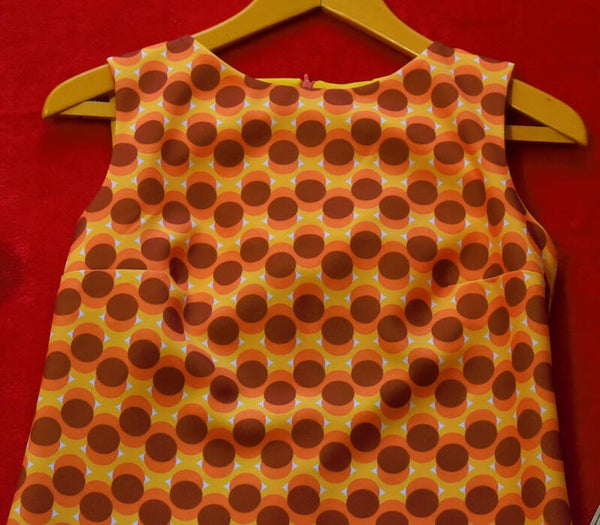 Vestido nuevo, retro, hecho a mano con tejido de polyester NO elástico con estampado de color naranja, amarillo y marrón. Ten en cuenta que es algo largo, no es mini.