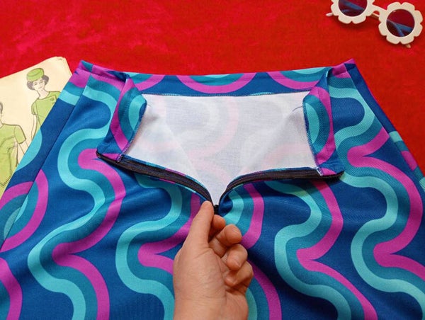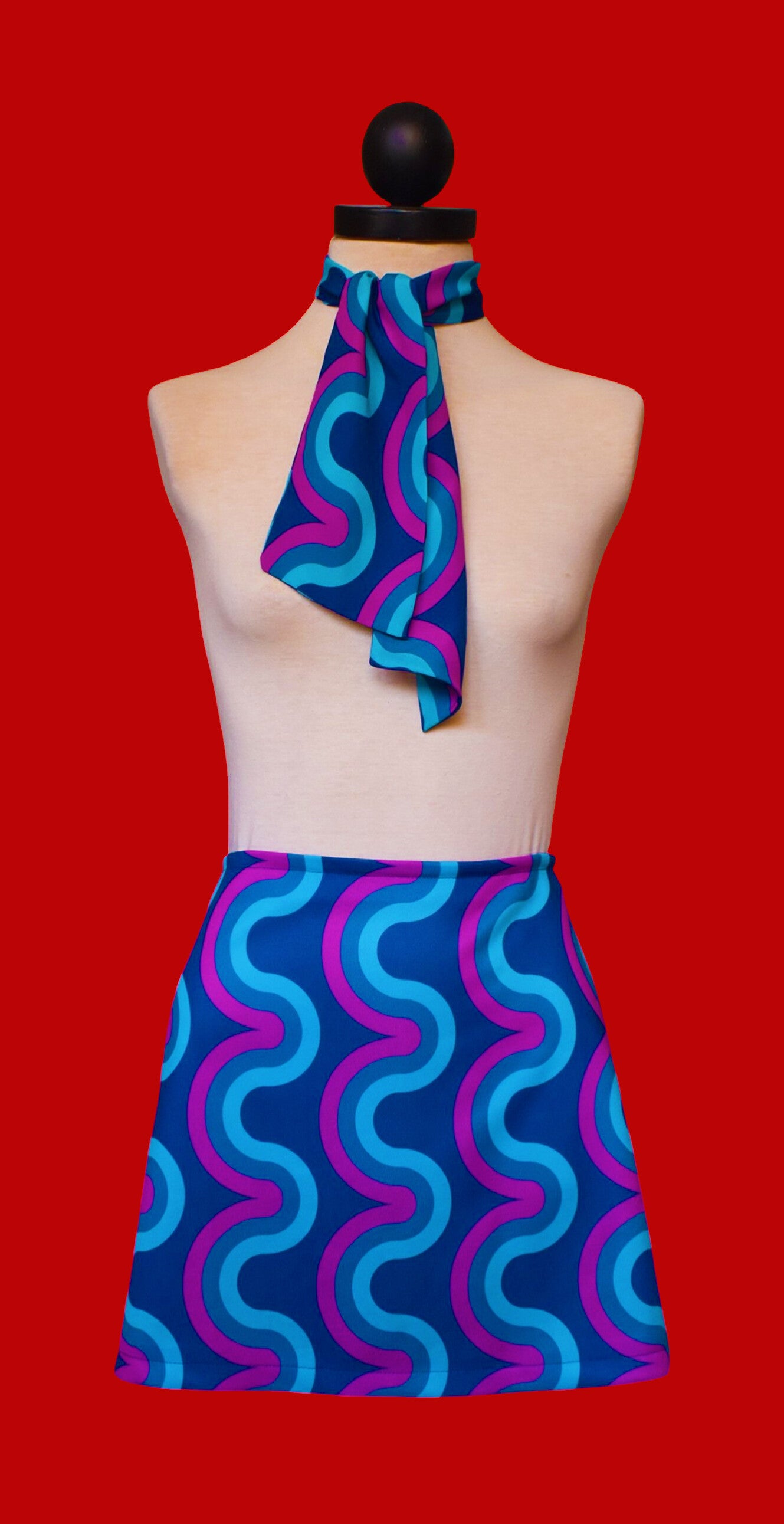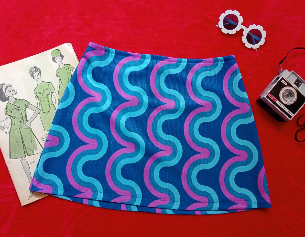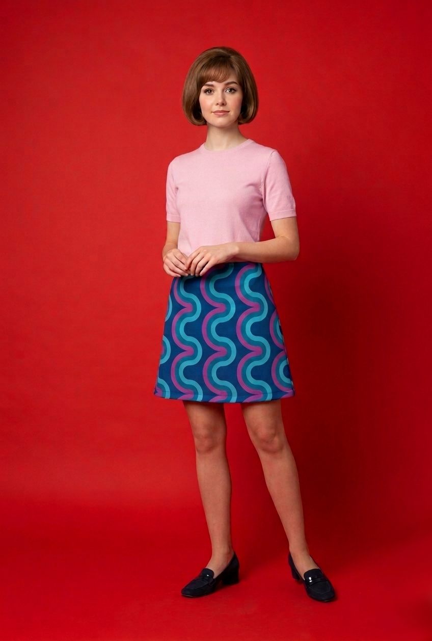 Falda corta hecha a mano en tejido de poliéster grueso y suave, estampado de diseño propio y edición lmitada de color azul oscuro, con tonos de azul y rosa. Cremallera en la parte trasera. Corte en A, a la cintura real. Está preparada para envío en talla 38 (10UK)