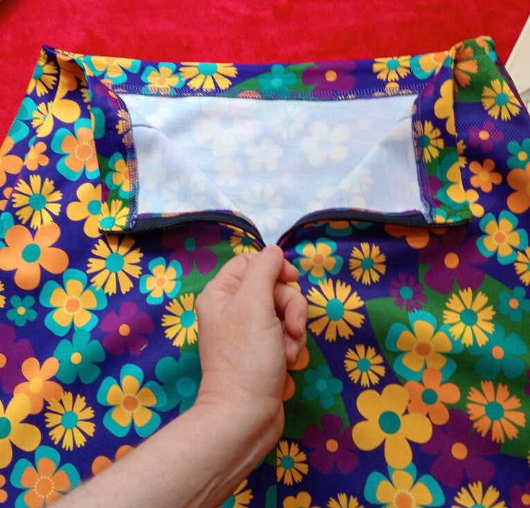 Color azul/morado de fondo, con detalles en verde, y flores naranjas, amarill,as azules. De corte en A, a la cintura real, con cremallera en la parte trasera.