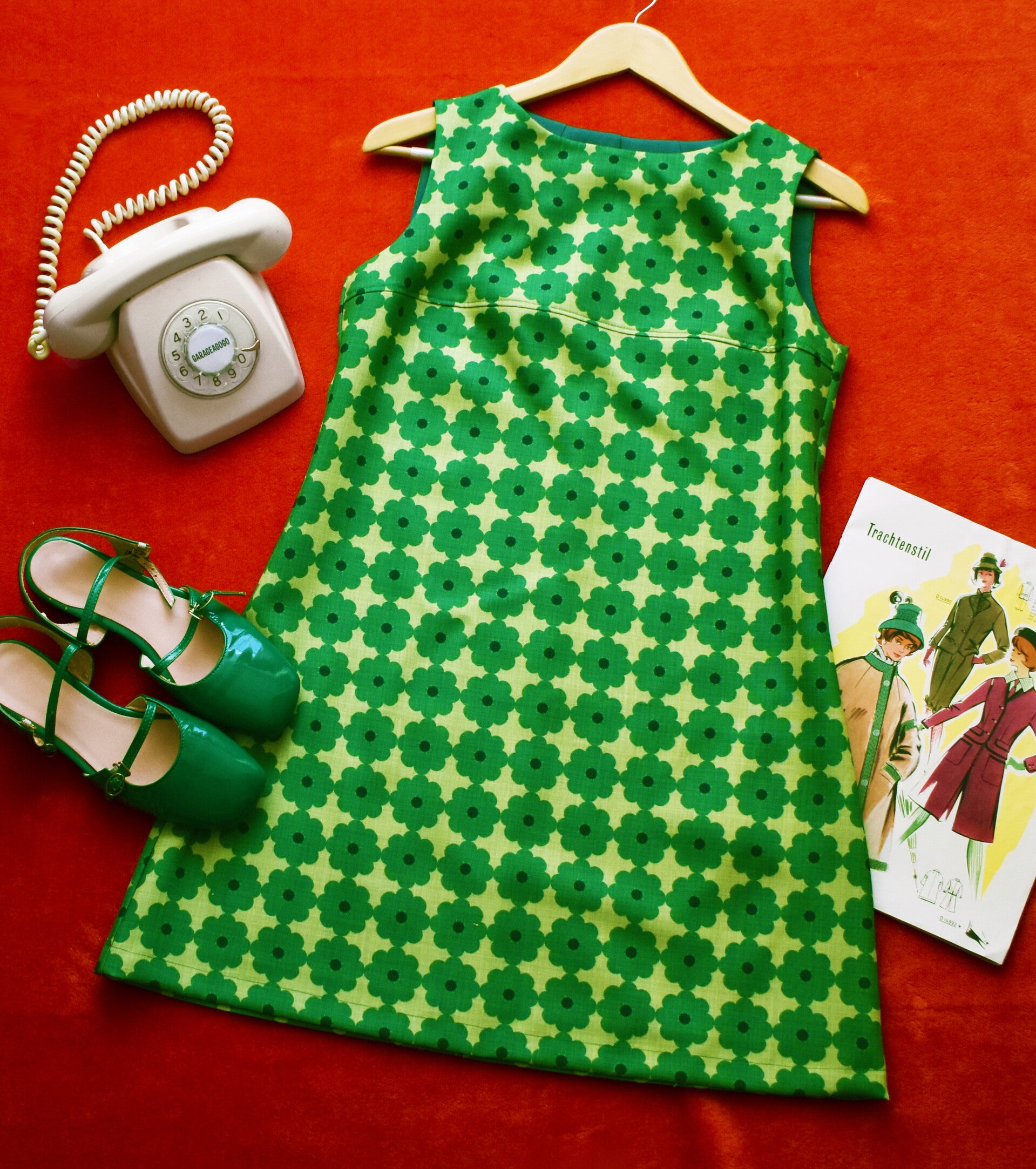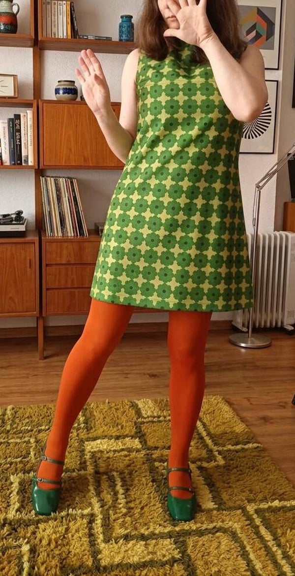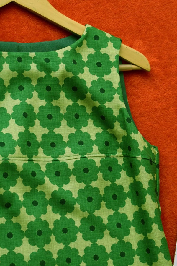 Vestido nuevo, retro, hecho a mano con tejido de polyester NO elástico estampado de flores en tonos verdes con efecto de "tela antigua"