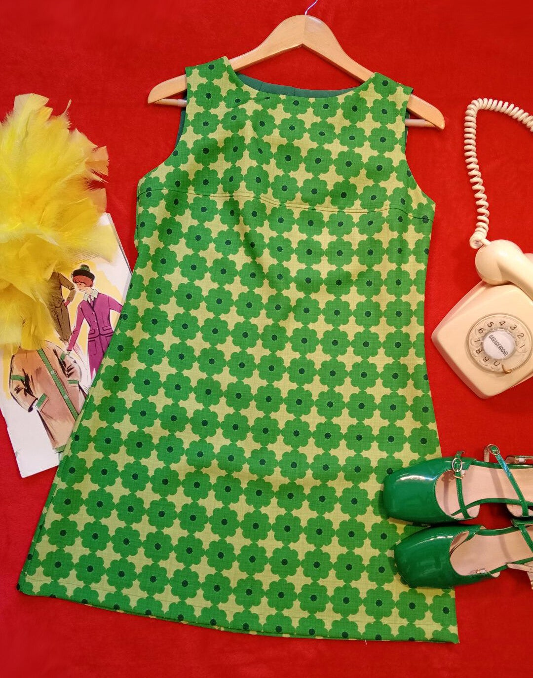 Vestido nuevo, retro, hecho a mano con tejido de polyester NO elástico estampado de flores en tonos verdes con efecto de "tela antigua"