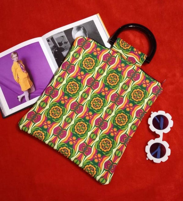 Mini vestido retro hecho a mano en tejido de poliéster no elástico con estampado de edición limitada, en tonos verdes, rosas, naranja...