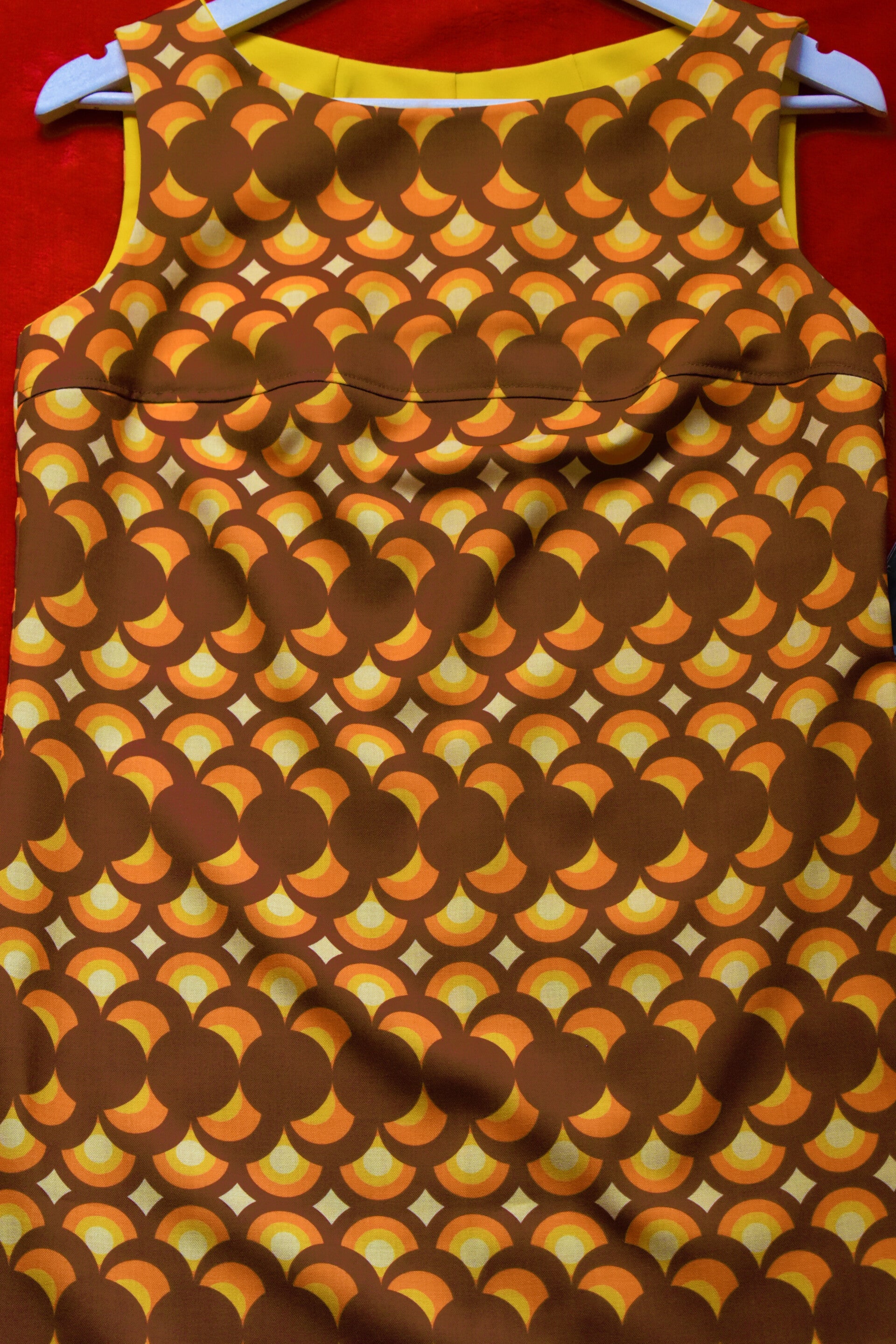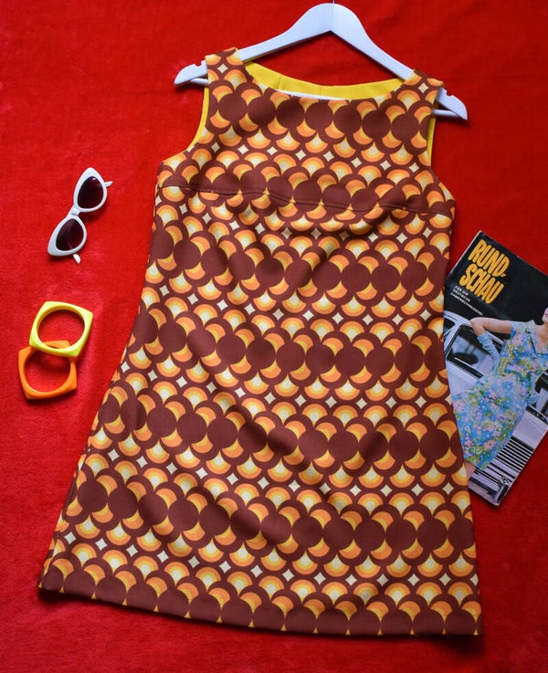 Vestido retro hecho a mano en tejido de poliéster no elástico con estampado de edición limitada, de color marrón, naranja, amarillo y crema.